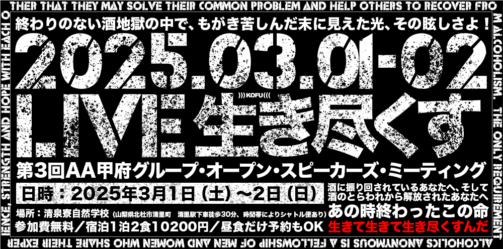 ポイント:会場は清泉寮から南に下った「自然学校」にて/車はスタッドレス必須/日帰りでも泊まりでも参加oK/メインルームやや手狭故、アツいスピーカーになること必至!/宿泊定員70名/中四国RU→山梨SSで好評だった焚火Mアリ?/希望により子供向け自然プログラム検討/標高1350mの清里高原は最高気温0°Cの日もある極寒エリア!だが「春はすぐソコ」みんなで、シラフでのあったかい思い出を目一杯、清里で作っていこう!
